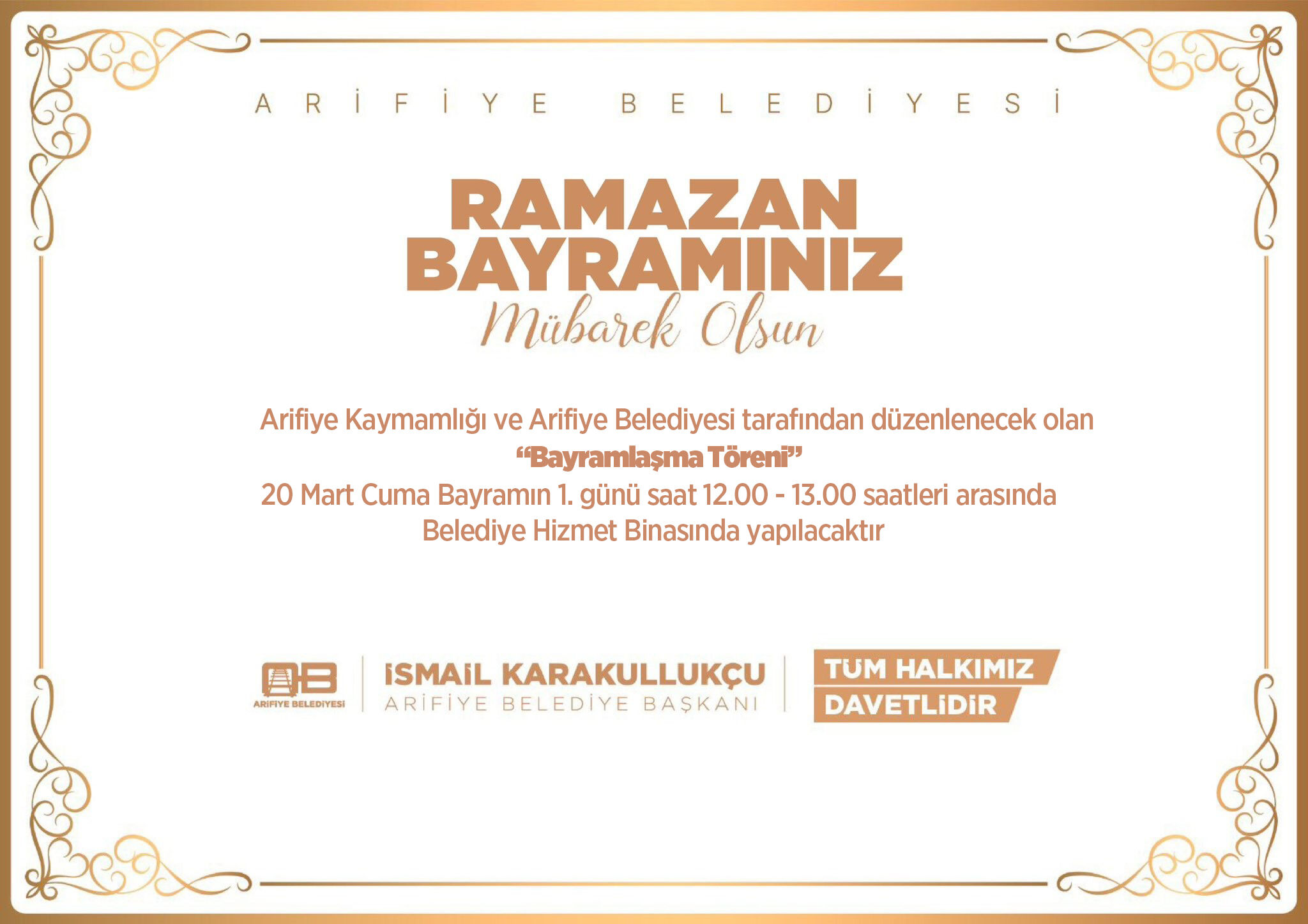 Arifiye Kaymakamlığı ve Arifiye Belediyesinin birlikte düzenleyecekleri bayramlaşma programı, bayramın birinci günü olan Cuma günü saat 12.00-13.00 saatleri arasında Arifiye Belediyesi Hizmet Binası önünde gerçekleştirilecek.