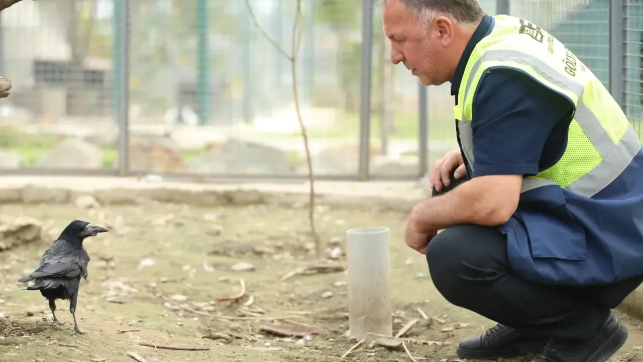 İnsanlardan kaçmayan karga, görevlilerin çağırması üzerine yanlarına geliyor, omuzlarına ve kollarına konup ellerinden yem yiyor.